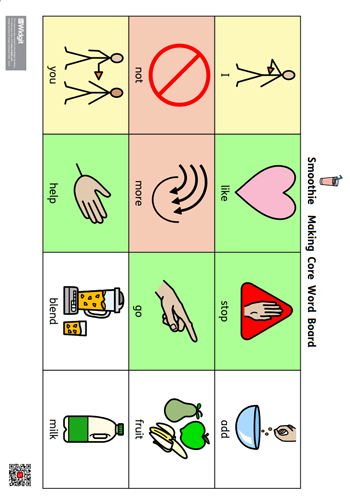 A Core Word board and fruit smoothie-related fringe vocabulary. This colour-coded Core Board uses an adapted Fitzgerald key.